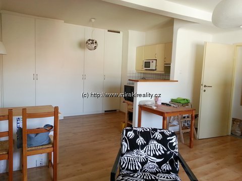 Vybavení: byt je v dobré kondici a průběžně udržován, okna v předsíni a pokoji jsou orientována do JZ klidného vnitrobloku. Kuchyňská linka na míru, plynový dvouvařič, MW trouba, chytře řešené vestavné prostorné šatní a úložné skříně, lednice s mrazákem, kuchyňská část opticky oddělena malým barovým pultem od pokoje. Bez nábytku, v koupelně sprchovací vyzděný kout, koupelnový nábytek na míru, pračka nebo přípojka, drobné úložné skříňky, samostatná prostorná toaleta opět s úložnými prostory.