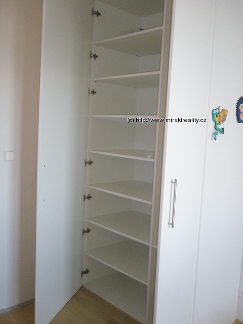 Vybavení: moderní nové vestavné skříně-dostatek místa, kuchyňská linka – plynový varná deska, el. trouba, myčka, digestoř, vestavěná lednice s mrazákem, mikrovlnka, moderní stůl se židlemi, na míru řešená policová knihovna s psacím stolem, dvoulůžko, rozkládací pohovka, pračka, v koupelně vana, WC zvlášť, vše nové nebo zánovní;vymalováno.