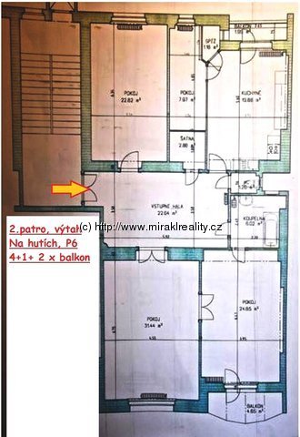 Velikost bytu: 4+1 + 2 x balkon, jeden do ulice a druhý do vnitrobloku; výměra bytu 145 m2; byt sestává z centrální vstupní haly, obývacího pokoje, 2 samostatných ložnic, kuchyně s kuchyňskou linkou, jedné pracovny, 2 komor, prostorné koupelny s vanou a zástěnou, separé toaleta; výška stropů 3,2 m, dvoukřídlé repasované dveře;
