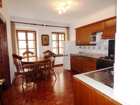 V bytě jsou restaurovány původní malované trámové stropy, zachované klenby, všechny místnosti jsou samostatně přístupné z centrální haly. Prostorné místnosti (obývací pokoj 30 m², ložnice 23 m², kuchyně 14 m², k dispozici jsou dvě koupelny, 1. s masážní vanou Jacuzzi, 2. koupelna se sprchovacím boxem. Rustikální, plně vybavená kuchyňská linka. Na podlahách jsou parkety a dlažba. V koupelně pračka. Vytápění elektrické. Špaletová okna.