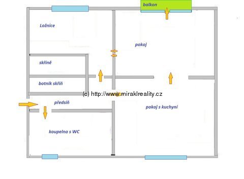 Velikost bytu: 2+1 + balkon do vnitrobloku – zahrady - velký sklep-10 m2, výměra bytu 54 m2, samostatné vstupy do místností;
