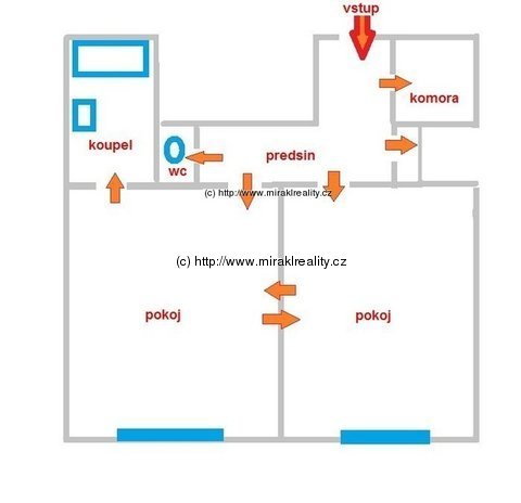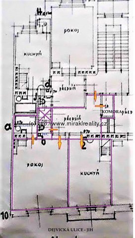 Velikost bytu: 2+k.k., 64,25 m2; 2 pokoje á 24 a 25,5 m2, komora 1,2 m2, koupelna 3,75 m2, předsíň 9 m2, nové WC-separé;